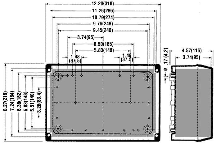 K 9504, Liquid Tight Polystrene Enclosure (Indoor Installation), from 6 - 1 AWG 3 phase, 4-pole, with Terminal Block Dimensions: (W) 12.20" (310) x (H) 8.27"(210) x (D) 4.57"(116)